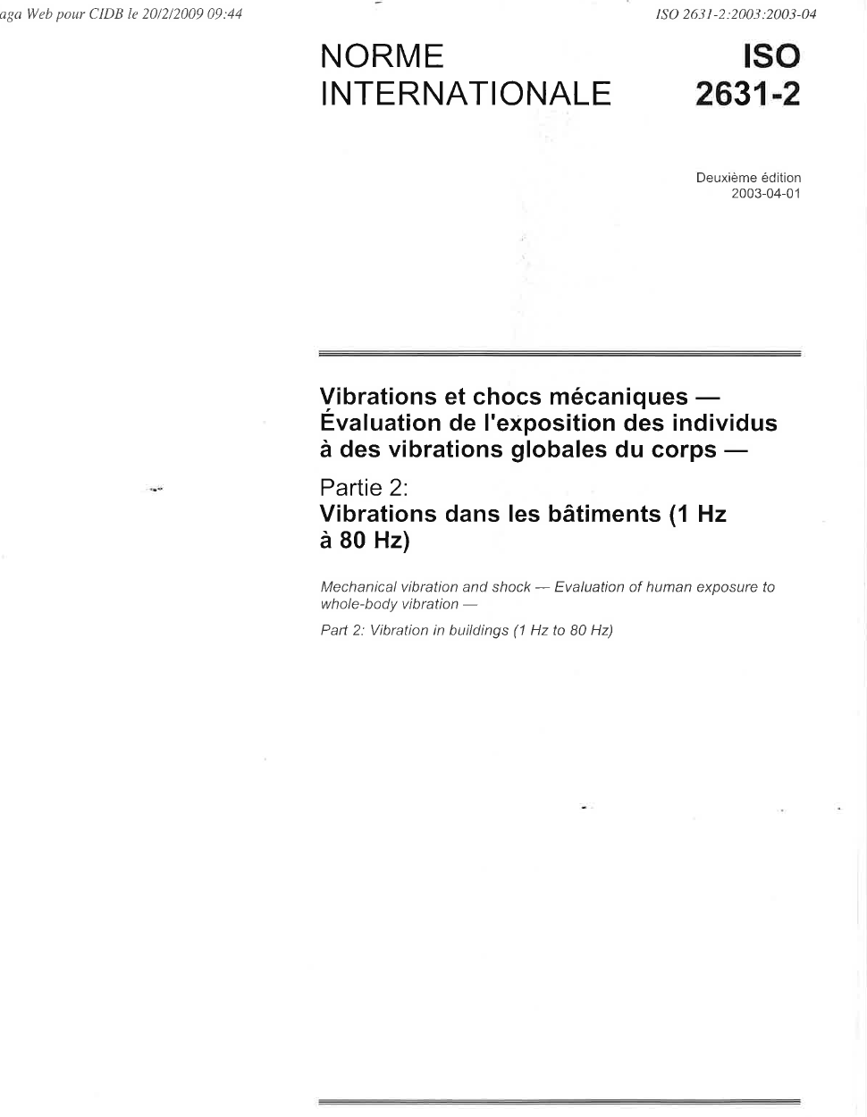 Norme ISO 2631-2. Vibrations et chocs mécaniques - Évaluation de l'exposition des individus à des vibrations globales du corps. Partie 2 : Vibrations dans les bâtiments (1 Hz à 80 Hz)