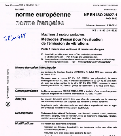 Norme ISO 28927-1. Machines à moteur portatives. Méthodes d'essai pour l'évaluation de l'émission de vibrations. Partie 1 : meuleuses verticales et meuleuses d'angles