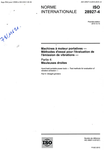 Norme ISO 28927-4. Machines à moteur portatives. Méthodes d'essai pour l'évaluation de l'émission de vibrations. Partie 4 : Meuleuses droites