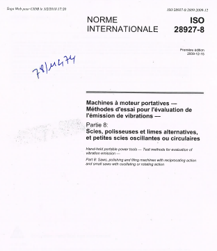 Norme ISO 28927-8. Machines à moteur portatives. Méthodes d'essai pour l'évaluation de l'émission de vibrations. Partie 8 : Scies, polisseuses et limes alternatives, et petites scies oscillantes ou circulaires