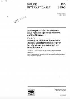 Norme ISO 389-3. Acoustique. Zéro de référence pour l'étalonnage d'équipements audiométriques. Partie 3 : Niveaux de référence équivalents de force vibratoire liminaire pour les vibrateurs à sons purs et les ossivibrateurs