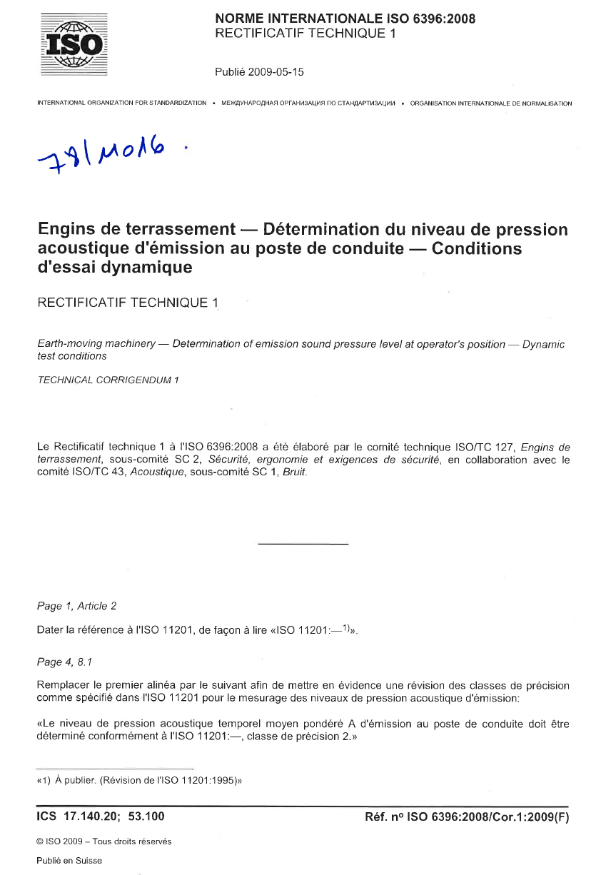 Norme ISO 6396. Engins de terrassement. Détermination du niveau