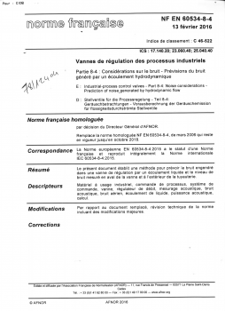 Norme NE EN 60534-8-4. Vannes de régulation des processus industriels. Partie 8-4 : considérations sur le bruit. prévision du bruit généré par un écoulement hydrodynamique