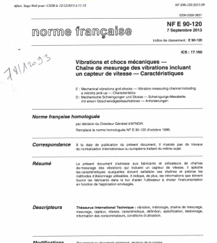 Norme NF E 90-120. Vibrations et chocs mécaniques. Chaîne de mesurage des vibrations incluant un capteur de vitesse. Caractéristiques