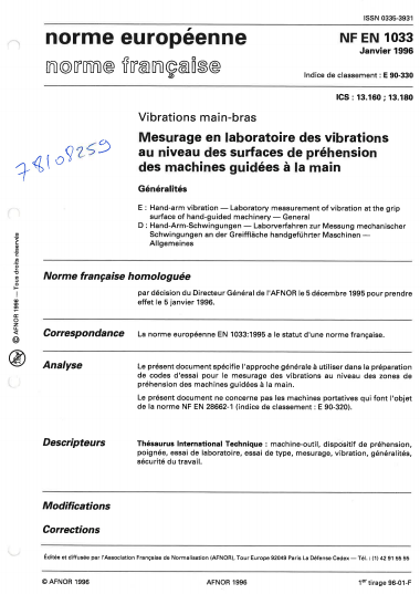Norme NF EN 1033. Mesurage en laboratoire des vibrations au niveau des surfaces de préhension des machines guidées à la main