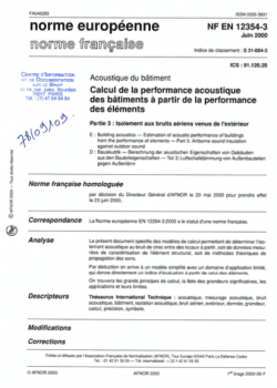 Norme NF EN 12354-3. Calcul de la performance acoustique des bâtiments à partir de la performance des bâtiments, Partie 3: Isolement aux bruits aériens venus de l'extérieur