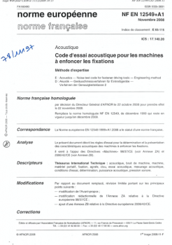 Règles d'essai pour la détermination et la présentation des caractéristiques acoustiques des machines à enfoncer les fixations. Cette norme vient à l'appui des Directives "Machines" 98/37/ce (voir Annexe ZA) et 2006/42/CE (voir Annexe ZB). Elle remplace celle homologuée NF EN 12549 de décembre 1999 qui reste en vigueur jusqu'en décembre 2009 (78/09027). -