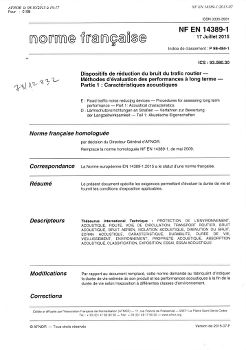 Norme NF EN 14389-1. Dispositifs de réduction du bruit du trafic routier. Méthodes d'évaluation des performances à long terme. Partie 1 : caractéristiques acoustiques.