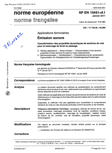 Norme NF EN 15461+A1. Applications ferroviaires. Émission sonore. Caractérisation des propriétés dynamiques de sections de voie pour le mesurage du bruit au passage