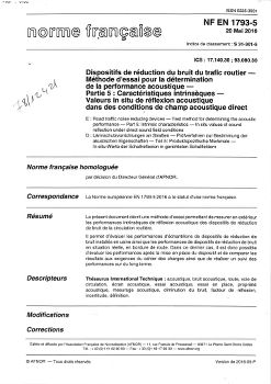 Norme NF EN 1793-5. Dispositifs de réduction du bruit du trafic routier. Méthode d'essai pour la détermination de la performance acoustique. Partie 5 : Caractéristiques intrinsèques. Valeurs in situ de réflexion acoustique dans des conditions de champ aco