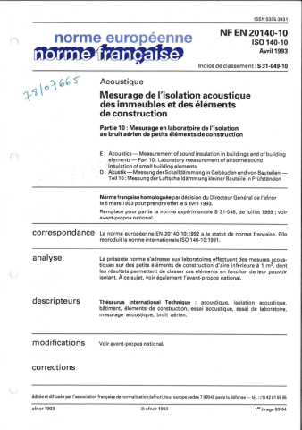 Norme NF EN 20140-10. Mesurage de l'isolation acoustique des immeubles et des éléments de construction, partie 10 : mesurage en laboratoire de l'isolation au bruit aérien de petits éléments de construction