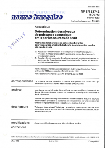 Norme NF EN 23742 ISO 3742. Détermination des niveaux de puissance acoustique émis par les sources de bruit. Méthodes de laboratoire en salles réverbérantes pour des sources émettant des bruits à composantes tonales et à basses fréquences