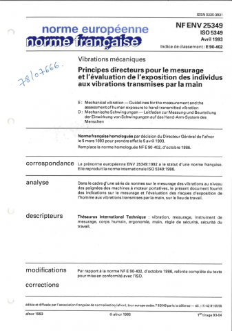 Norme NF EN 25349. Principes directeurs pour le mesurage et l'évaluation de l'exposition des individus aux vibrations transmises par la main