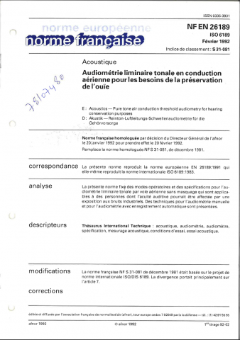 Norme NF EN 26189 ISO 6189. Audiométrie liminaire tonale en conduction aérienne pour les besoins de la préservation de l'ouïe