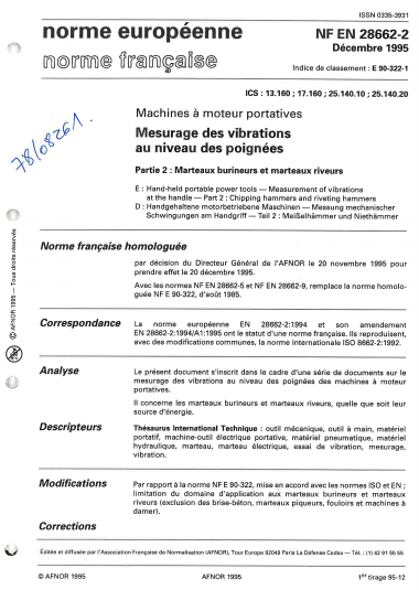 Norme NF EN 28662-2. Machines à moteur portatives : Mesurage des vibrations au niveau des poignées. Partie 2 : Marteaux burineurs et marteaux riveurs