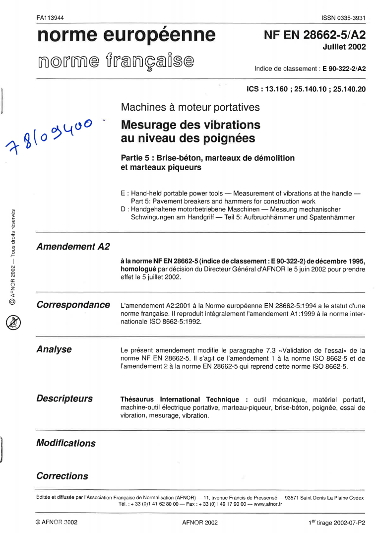 Ce document modifie le paragraphe 7.3 validation de l’essai de la norme NF EN 28662-5. (Voir réf. CIDB : 78/08262). -