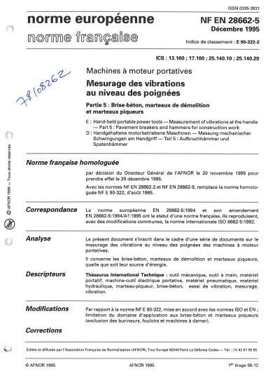 Norme NF EN 28662-5. Machines à moteur portatives. Mesurage des vibrations au niveau des poignées. Partie 5 : Brise-béton, marteaux de démolition et marteaux piqueurs