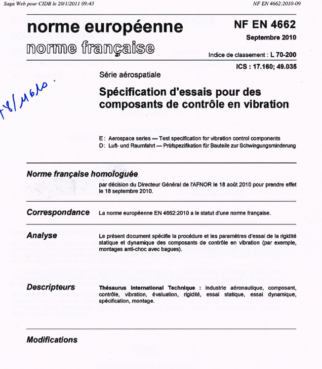 Norme NF EN 4662. Série aérospatiale. Spécification d'essais pour des composants de contrôle en vibration