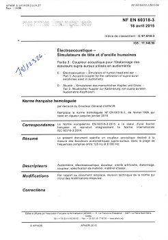 Norme NF EN 60318-3. Électroacoustique. Simulateurs de tête et d'oreille humaines. Partie 3 : coupleur acoustique pour l'étalonnage des écouteurs supra-auraux utilisés en audiométie.
