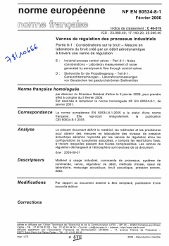 Norme NF EN 60534-8-1. Vannes de régulation des processus industriels. Partie 8-1 : Considérations sur le bruit - Mesures en laboratoire du bruit créé par un débit aérodynamique à travers une vanne de régulation