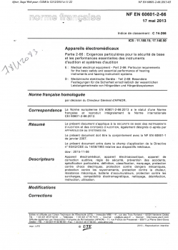 Norme NF EN 60601-2-66. Appareils électromédicaux. Partie 2-66 : Exigences particulières pour la sécurité de base et les performances essentielles des instruments d'audition et systèmes d'audition