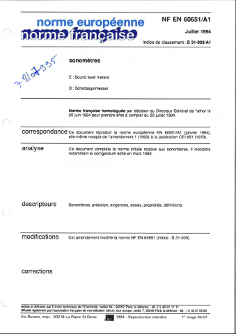 Norme NF EN 60651/a1. Sonomètres.