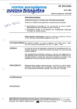 Norme NF EN 61043. Instruments pour la mesure de l'intensité acoustique