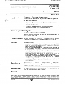Norme NF EN 61161. Ultrasons. Mesurage de puissance. Balances de forces de rayonnement et exigences de fonctionnement