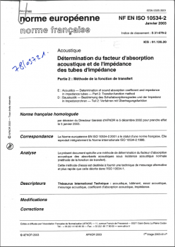 Norme NF EN ISO 10531-2. Détermination du facteur d'absorption acoustique de l'impédance des tubes d'impédance. Partie 2 : méthode de la fonction de transfert.