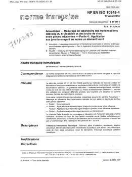 Norme NF EN ISO 10848-4. Acoustique. Mesurage en laboratoire des transmissions latérales du bruit aérien et des bruit de choc entre pièces adjacentes. Partie 4 : Application aux jonctions ayant au moins un éléments lourd