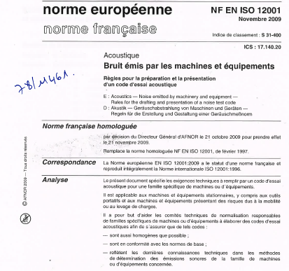 Norme NF EN ISO 12001. Bruit émis par les machines et équipements. Règles pour la préparation et la présentation d'un code d'essai acoustique