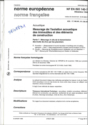 Norme NF EN ISO 140-7. Mesurage de l'isolation acoustique des immeubles et des éléments de construction, Partie 7 : Mesurage in situ de la transmission des bruits de chocs par les planchers