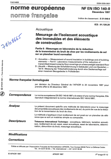 Norme NF EN ISO 140-8. Mesurage de l'isolement acoustique des immeubles et des éléments de construction, Partie 8 : mesurages en laboratoire de la réduction de la transmission du bruit de choc par les revêtements de sol sur un plancher lourd normalisé