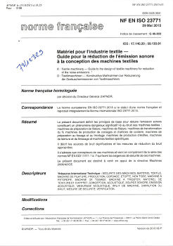 Norme NF EN ISO 23771. Matériel pour l'industrie textile. Guide pour la réduction de l'émission sonore à la conception des machines textiles