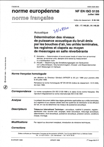 Norme NF EN ISO 5135. Détermination des niveaux de puissance acoustique du bruit émis par les bouches d'air, les unités terminales, les registres et clapets au moyen de mesurages en salle réverbérante