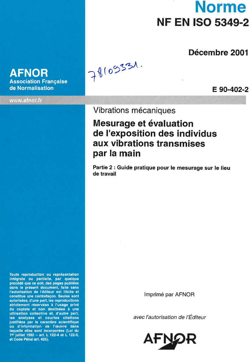 Norme NF EN ISO 5349-2. Mesurage et évaluation de l'exposition des individus aux vibrations transmises par la main. Partie 2. Guide pratique pour le mesurage sur le lieu de travail