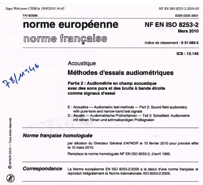 Norme NF EN ISO 8253-2. Méthodes d'essais audiométriques. Partie 2 : Audiométrie en champ acoustique avec des sons purs et des bruits à bande étroite comme signaux d'essai. 2010