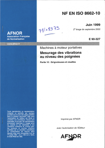 Norme NF EN ISO 8662-10. Mesurage des vibrations du niveau des poignées, Partie 10 : Grignoteuses et cisailles