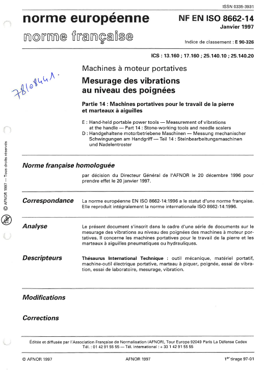 Norme NF EN ISO 8662-14. Mesurage des vibrations au niveau des poignées, partie 14 : Machines portatives pour le travail de la pierre et marteau à aiguilles