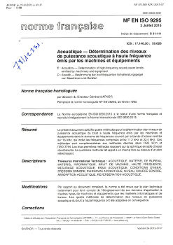Norme NF EN ISO 9295. Acoustique. Détermination des niveaux de puissance acoustique à haute fréquence émis par les machines et équipements.