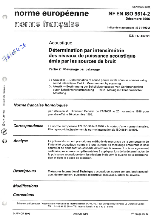 Norme NF EN ISO 9614-2. Acoustique, détermination par intensimétrie des niveaux de puissance acoustique émis