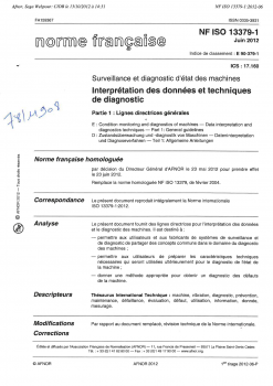 Norme NF ISO 13379-1. Surveillance et diagnostic d'état des machines. Interprétation des données et techniques de diagnostic. Partie 1 : Lignes directrices générales