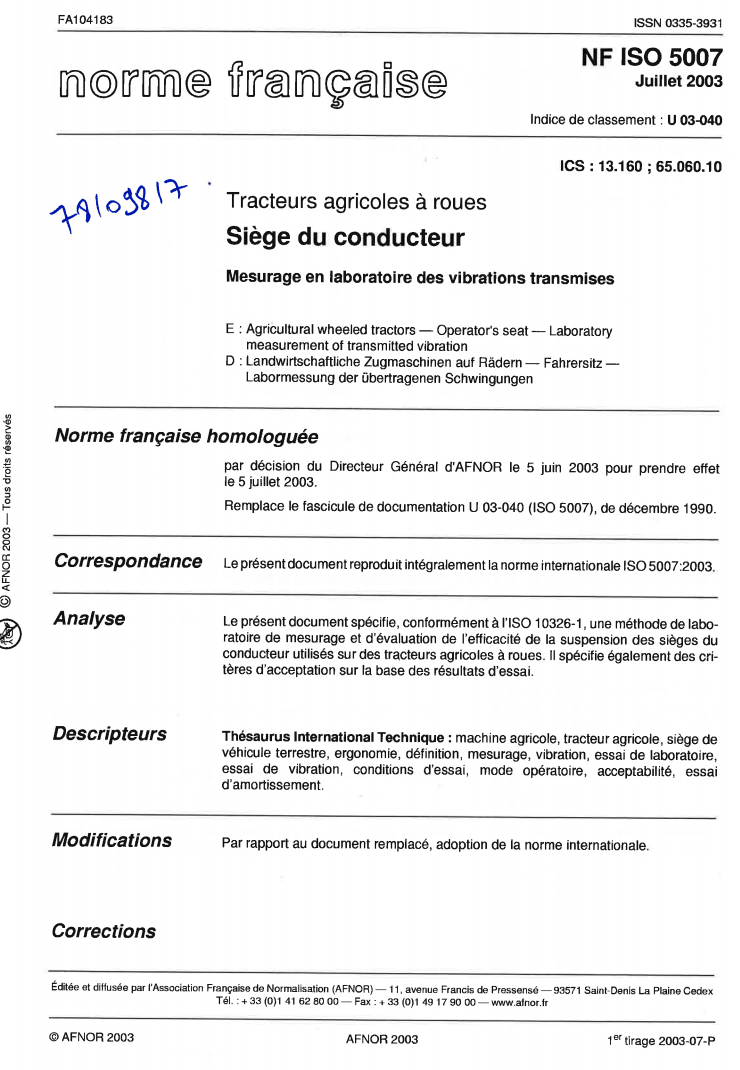Norme NF ISO 5007. Tracteurs agricoles à roues. Siège du conducteur. Mesurage en laboratoire des vibrations transmises.