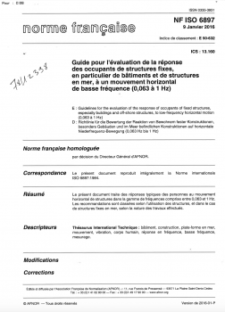 Norme NF ISO 6897. Guide pour l'évaluation de la réponse des occupants de structures fixes, en particulier de bâtiments et de structures en mer, à un mouvement horizontal de basse fréquence (0,063 à 1 Hz).