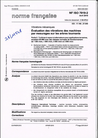 Norme NF ISO 7919-2. Évaluation des vibrations des machines par mesurages sur les arbres tournants. Partie 2 : Turbine à vapeur et alternateurs pour applications terrestres, excédant 50 MW avec des vitesses normales de fonctionnement de 1 500 r/min, 1 80