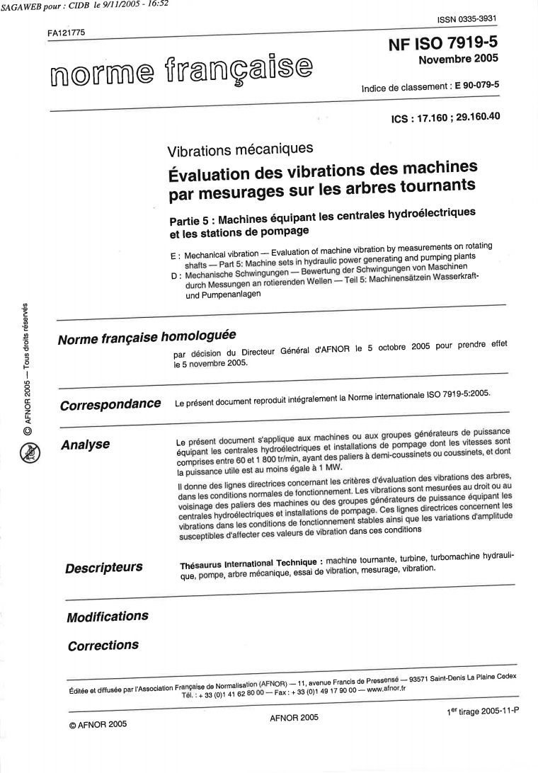 Norme NF ISO 7919-5 - Vibrations mécaniques - Évaluation des vibrations des machines par mesurages sur les arbres tournants - Partie 5 machines équipant les centrales hydroélectriques et les stations de pompage