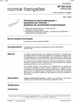 Norme NF ISO 8727. Vibrations et chocs mécaniques. Exposition de l'individu. Systèmes de coordonnées biodynamiques