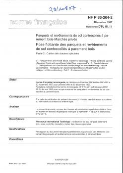 Norme NF P 63-204-1. Parquet et revêtement de sol contrecollés à parement bois. Pose flottante des parquet et revêtement de sol contrecollés à parement bois. Partie 1 : cahier des clauses techniques.