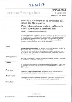 Norme NF P 63-204-2. Parquet et revêtement de sol contrecollés à parement bois. Pose flottante des parquet et revêtement de sol contrecollés à parement bois. Partie 2 : cahier des clauses spéciales.