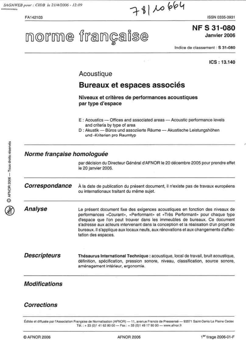 Norme NF S 31-080 - Acoustique - Bureaux et espaces associés - Niveaux et critères de performances acoustiques par type d'espace